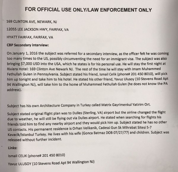 According to the official document time stamped Jan. 1, 2016, which was released by Turkish daily Hürriyet's columnist Sedat Ergin and later published by Anadolu Agency, Batmaz told American officials questioning him at New Jersey's Newark Airport in the U.S. that he "will stay with Imam Fetullah Gülen in Pennsylvania" during his visit to the country.