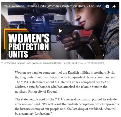 In contrast, the NYT article itself only focuses on YPG statements, even going so far as to include a video showing the terrorist singing with others, most likely intended as an emotional appeal to humanize the suicide bomber. The background of the terrorist, her birthplace, her story of how she ended up in the ranks of YPJ, were all widely covered. A YPJ promotional video also pops up on the article page.