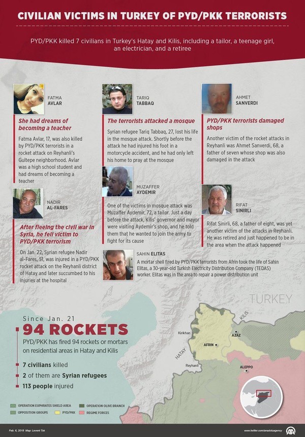 The PKK terrorist organization's Syrian branch the People's Protection Units (YPG) has killed a total of seven civilians and injured 113 in Turkey's border provinces of Hatay and Kilis since Jan. 21, the day after Turkey launched a counter-terrorist operation across the border in Syria.