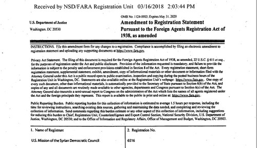 The initial request to register under the Foreign Agent Registration Act of Department of Justice was filed Jan. 31 by the Syrian Democratic Council (SDC), the political wing of the SDF, a little longer than a week after Turkey launched the Operation Olive Branch in Syria's Afrin. The request was followed by an amendment filed March 16.
