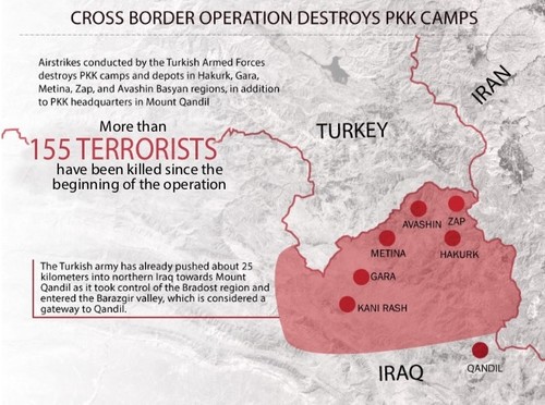 Since the beginning of the Turkish army's crossing into the Iraqi border in March, 155 PKK terrorists have been killed. The army had already pushed nearly 30 kilometers into northern Iraq towards Mount Qandil as it took control of the Bradost region and entered the Barazgir valley, which is considered a gateway to Qandil.