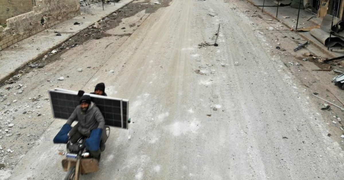 An aerial view shows Syrian men riding a motorcycle past destroyed shops in the village of Maaret al-Naasan in Idlib, Feb. 12, 2020. (AFP)