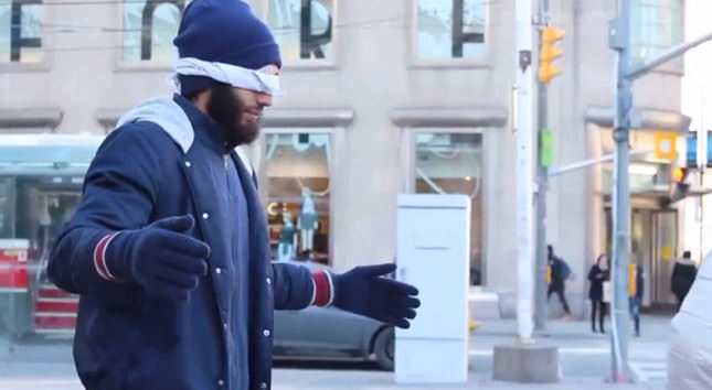 The three-minute video, which was posted on YouTube last week, features a blindfolded man in downtown Toronto standing next to a sign reading, "I am a Muslim. I am labelled as a terrorist and I trust you. Do you trust me? Give me a hug."