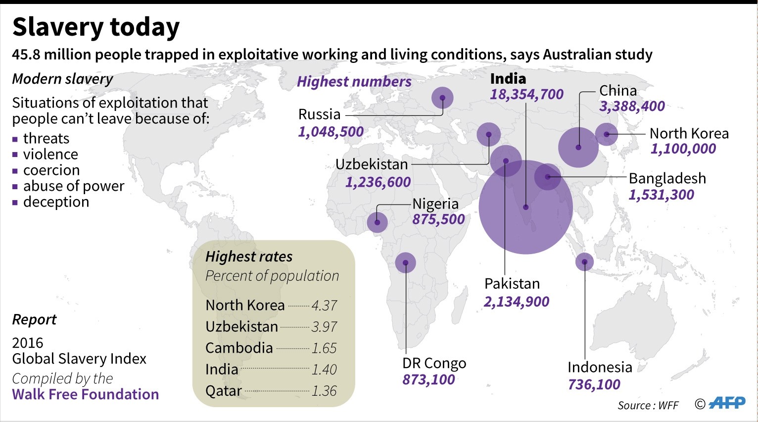 The Walk Free Foundation's Global Slavery Index said that India has by far the largest number of modern slaves, 18.35 million, followed by China with 3.39 million and Pakistan with 2.13 million.