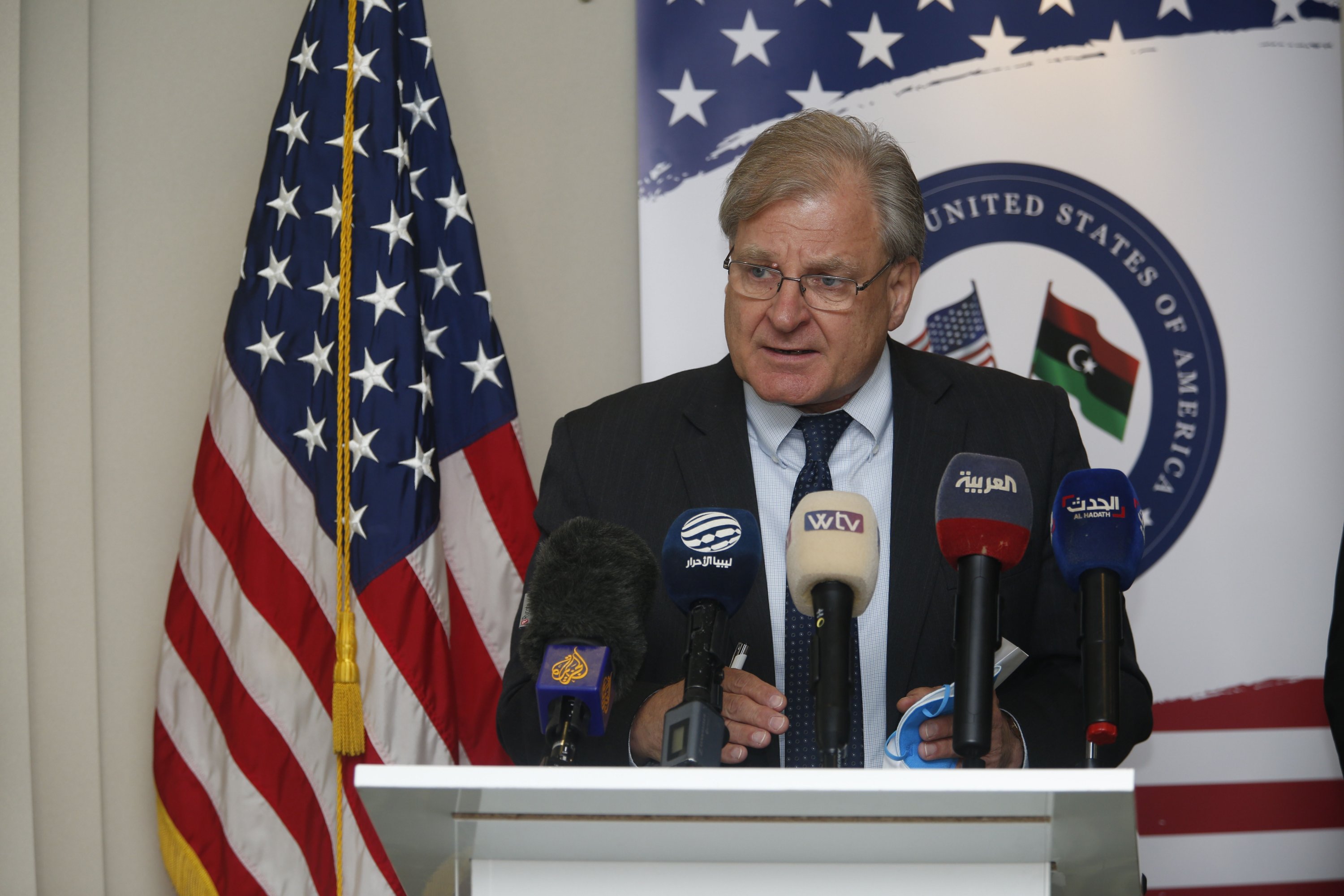Richard Norland, the U.S. special envoy to Libya who also serves as the U.S. ambassador to Libya, gives a press conference, in Tripoli, Libya, March 17, 2022. (AP Photo/Yousef Murad)