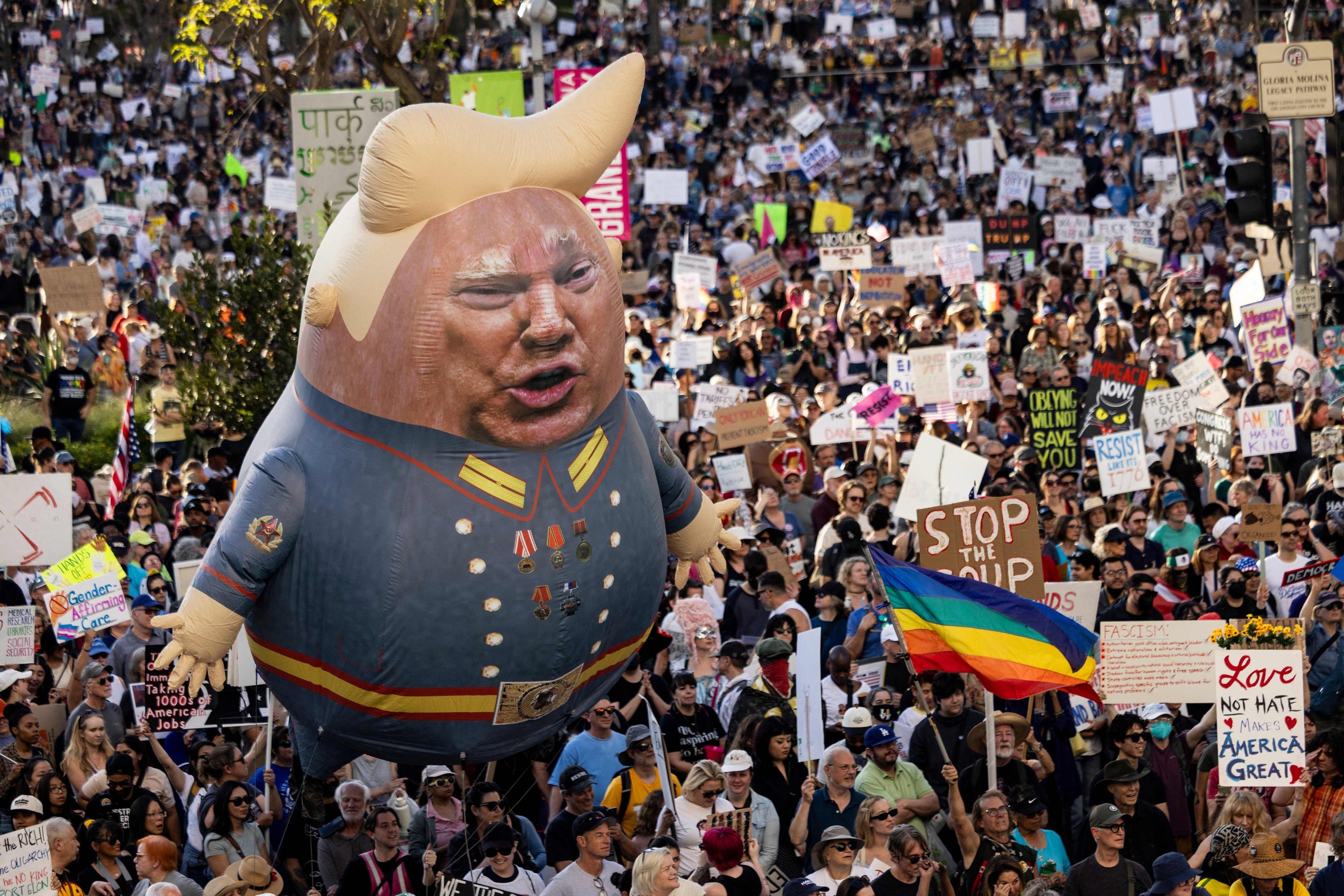 A large balloon with an image of U.S. President Donald Trump is seen above protesters holding signs during the nationwide "Hands Off!" protest against Trump and his advisor, Tesla CEO Elon Musk, in downtown Los Angeles on April 5, 2025. (AFP Photo)