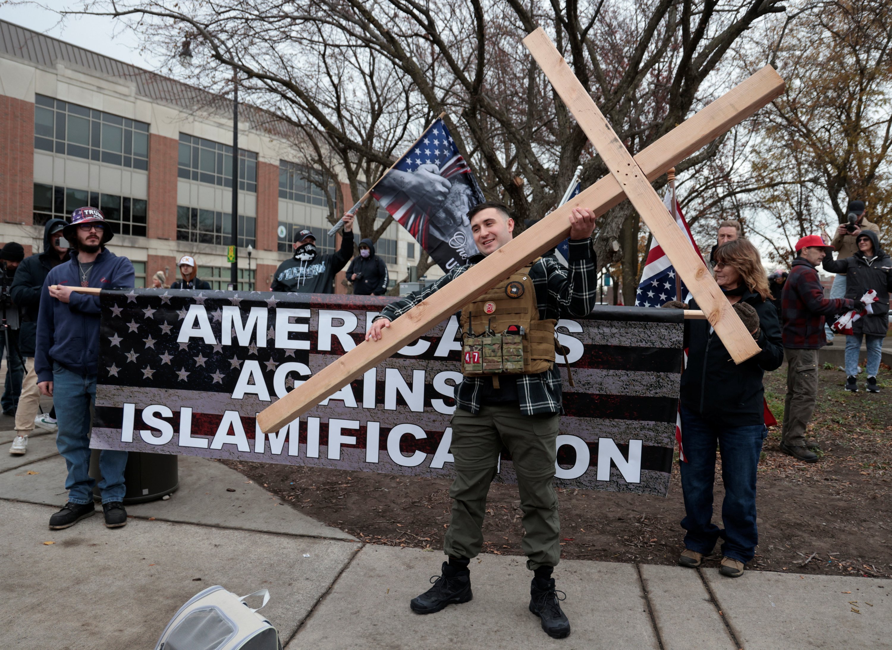 Lang had what appears to be a canister of lighter fluid in his hand as he threw Islam's holy book to the ground during Tuesday’s rally, prompting a counter-protester to reach down and grab it before it was set alight, according to footage of the incident posted to social media by independent journalist Brendan Gutenschwager.