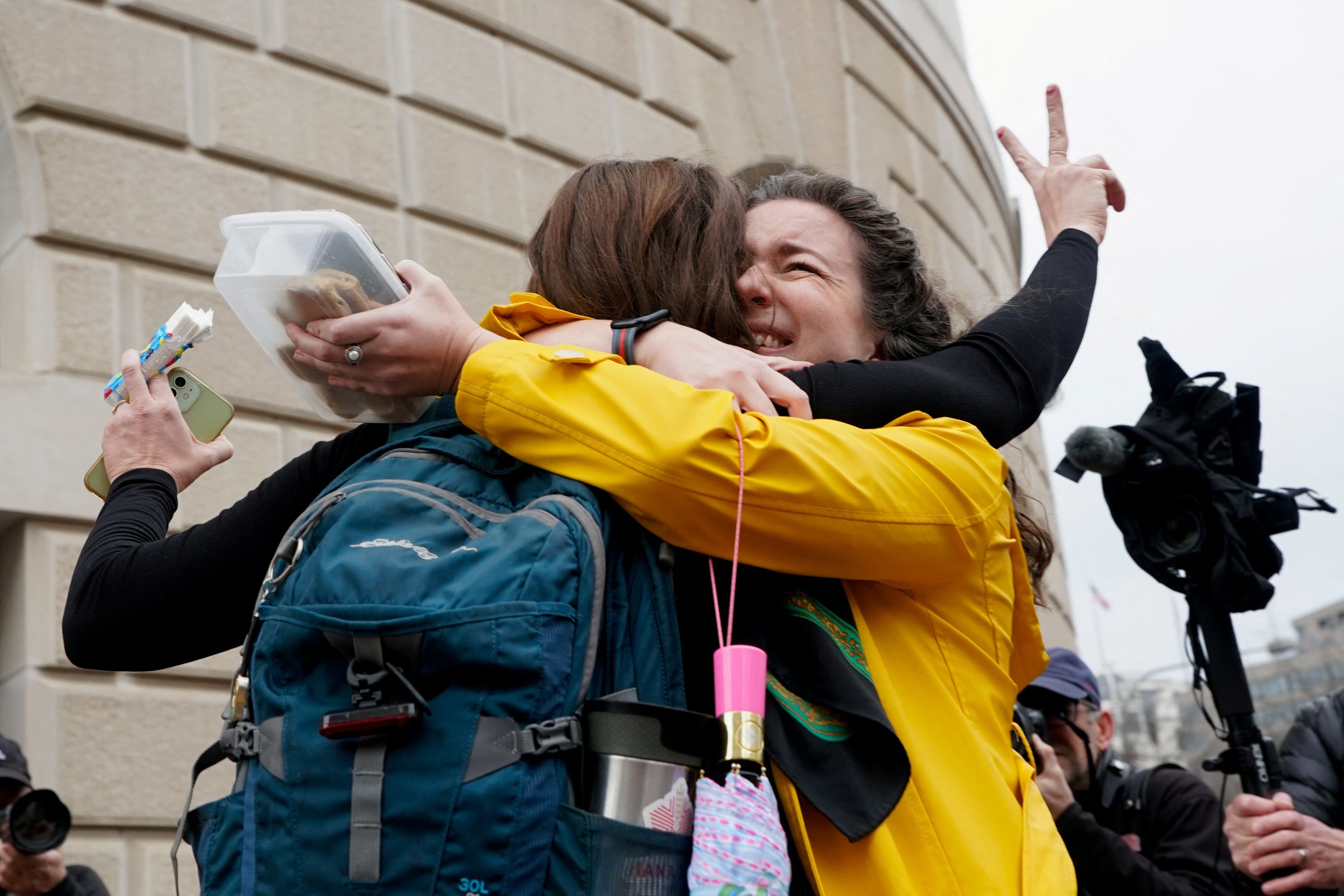 Supporters shouted encouragement and waved signs outside or drove by tapping their car horns. A little girl stood next to her mother holding a sign saying, "I am proud of you Daddy." A woman who left the building loaded down with bags burst into tears at the cheers greeting her. A small crowd of supporters enveloped her in hugs.