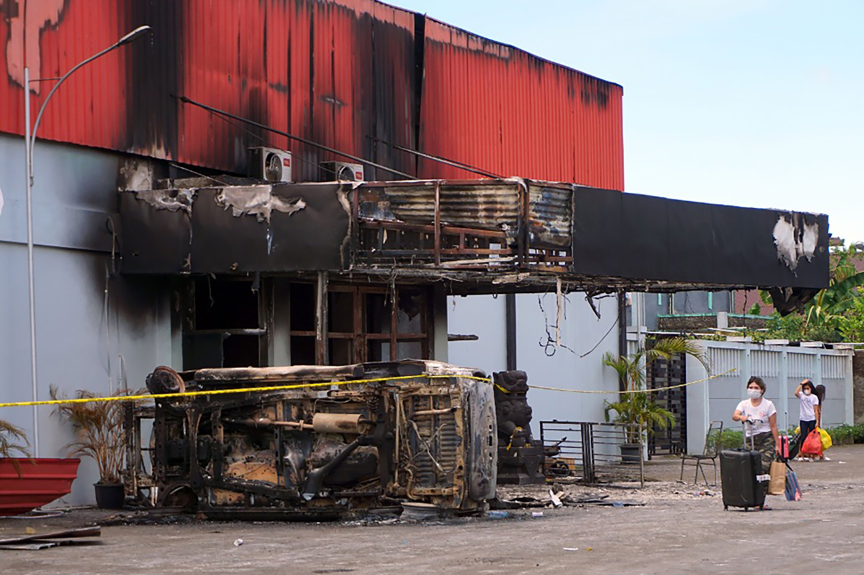 A woman carry her belonging as she walks near a torched nightclub in Sorong, West Papua province, Indonesia, Jan. 25, 2022. (AP Photo)