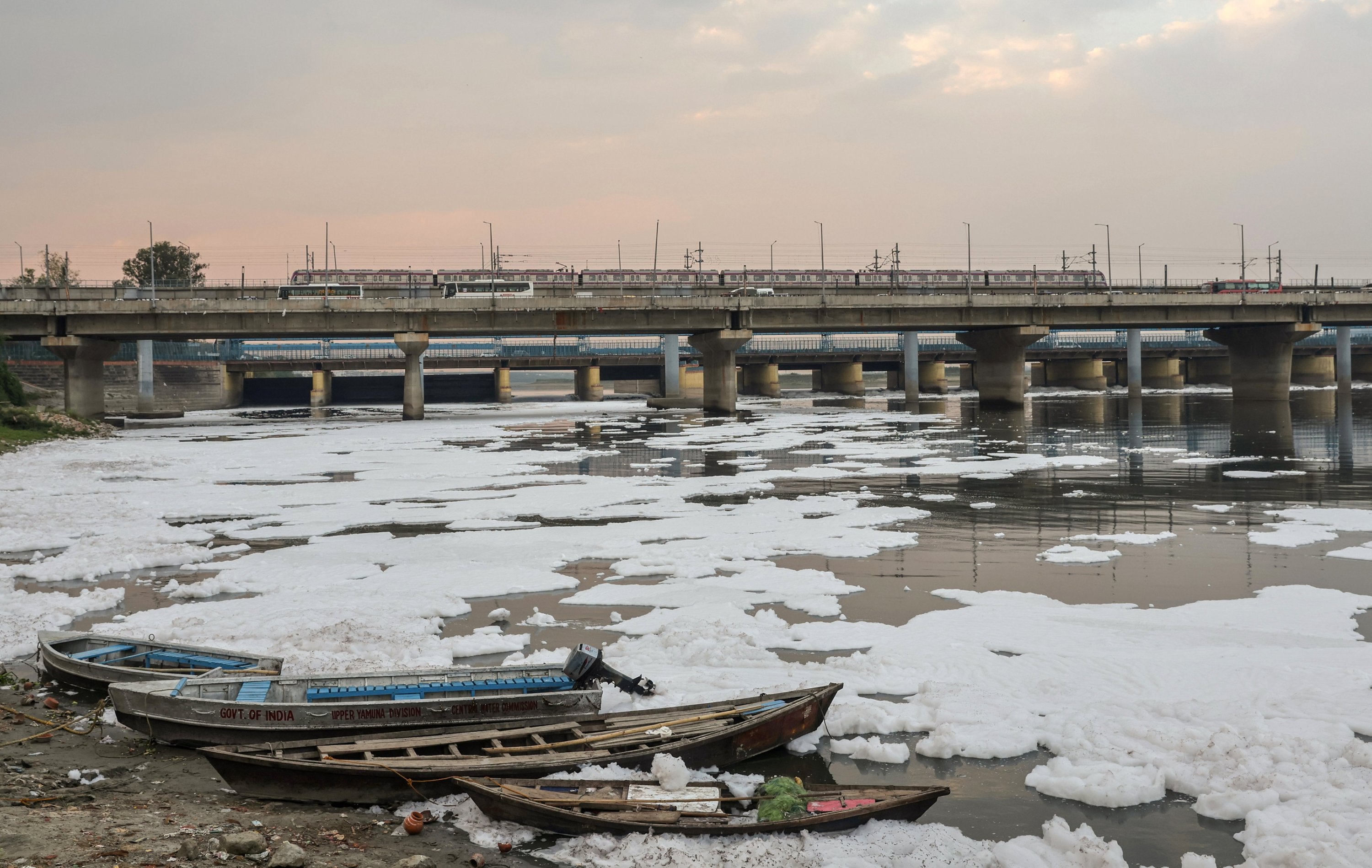 Boats sit amid toxic foam covering the Yamuna River in New Delhi, India, April 8, 2026. (EPA Photo)