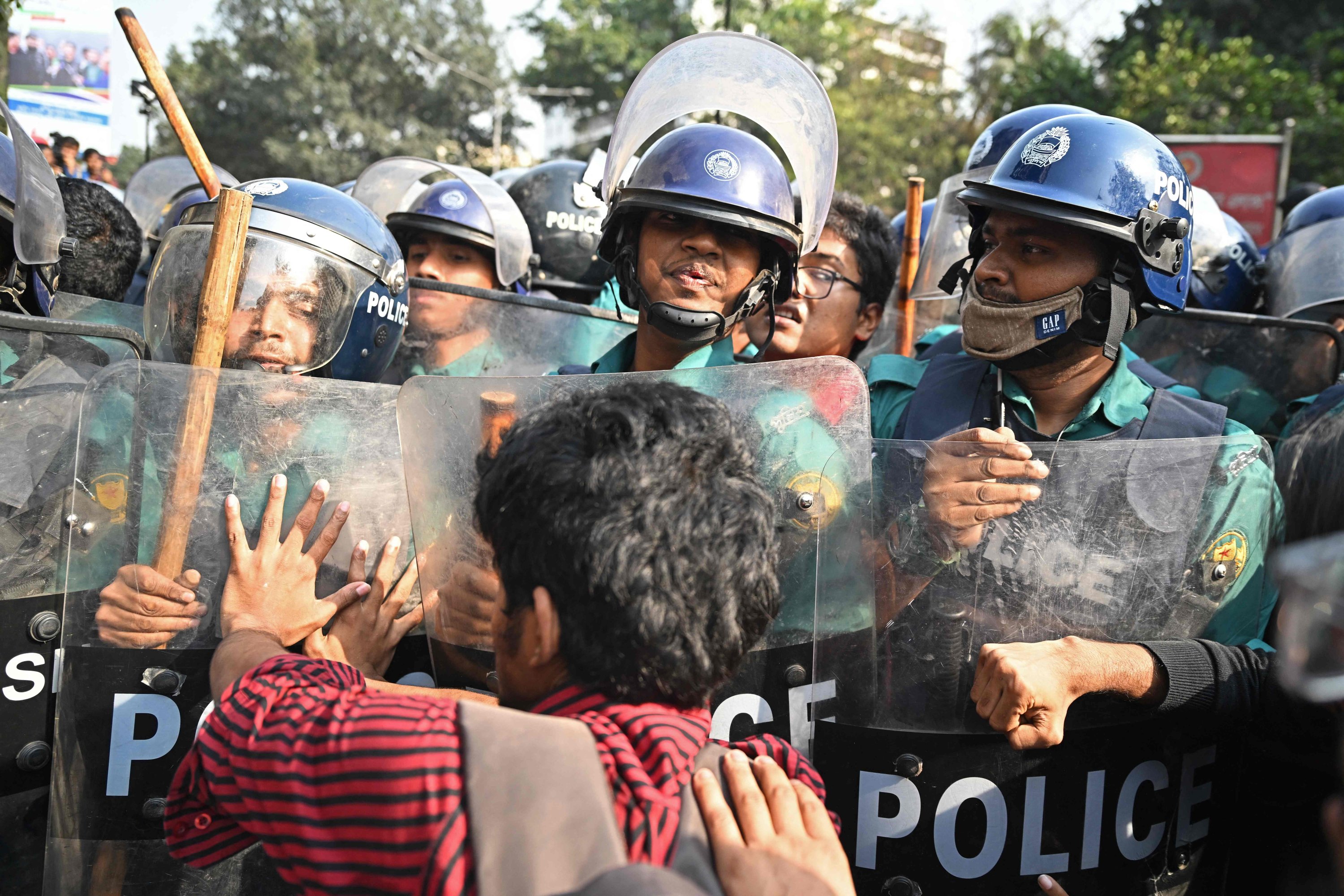 A demonstrator clashes with police during a protest march near the Home Ministry, demanding action against recent spate of crime, Dhaka, Bangladesh, Feb. 24, 2025. (AFP Photo)
