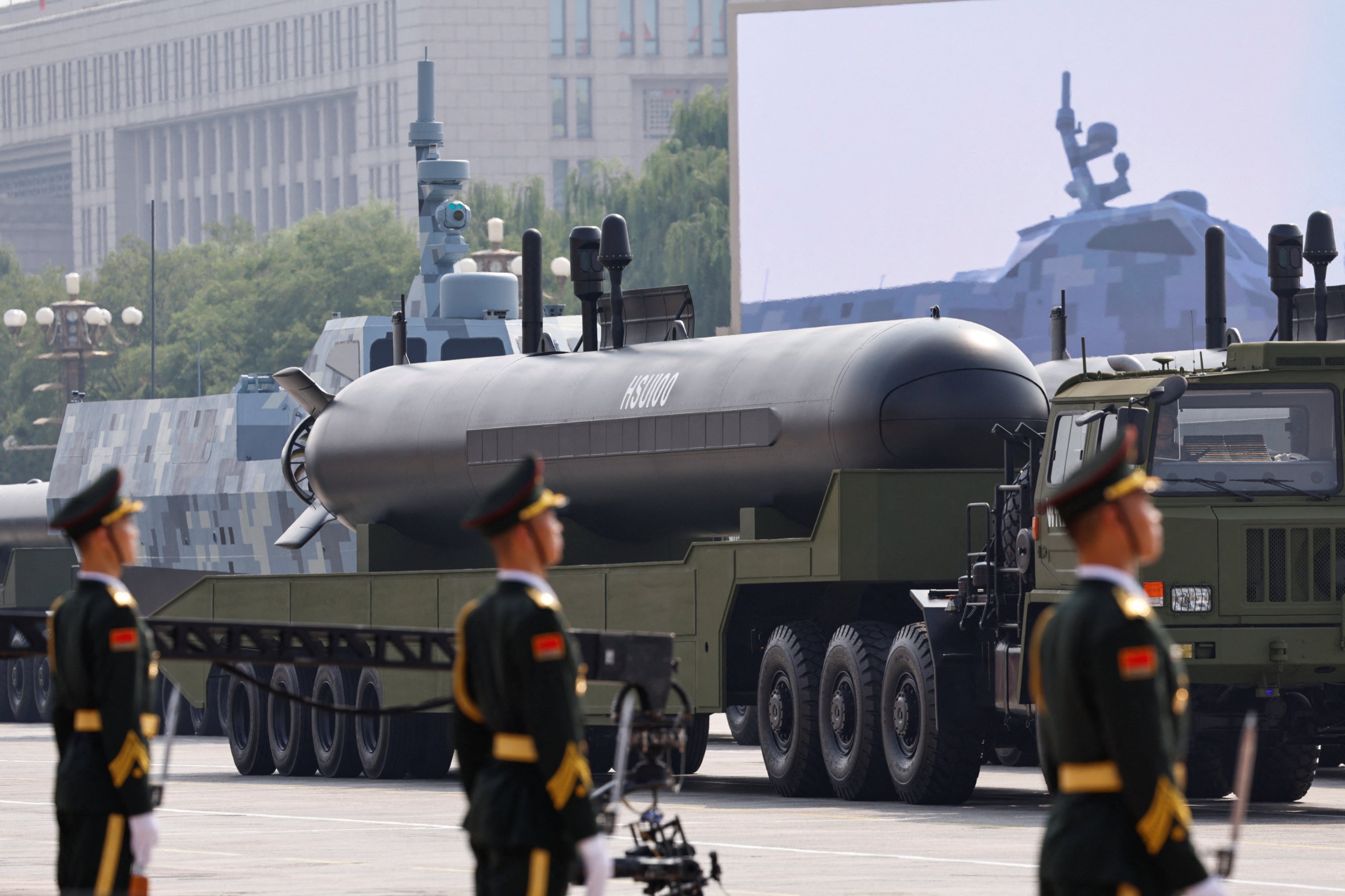 The parade featured two new, extra-large torpedo-shaped unmanned underwater vehicles – the AJX002 and the HSU100 – carried on top of long trucks.
