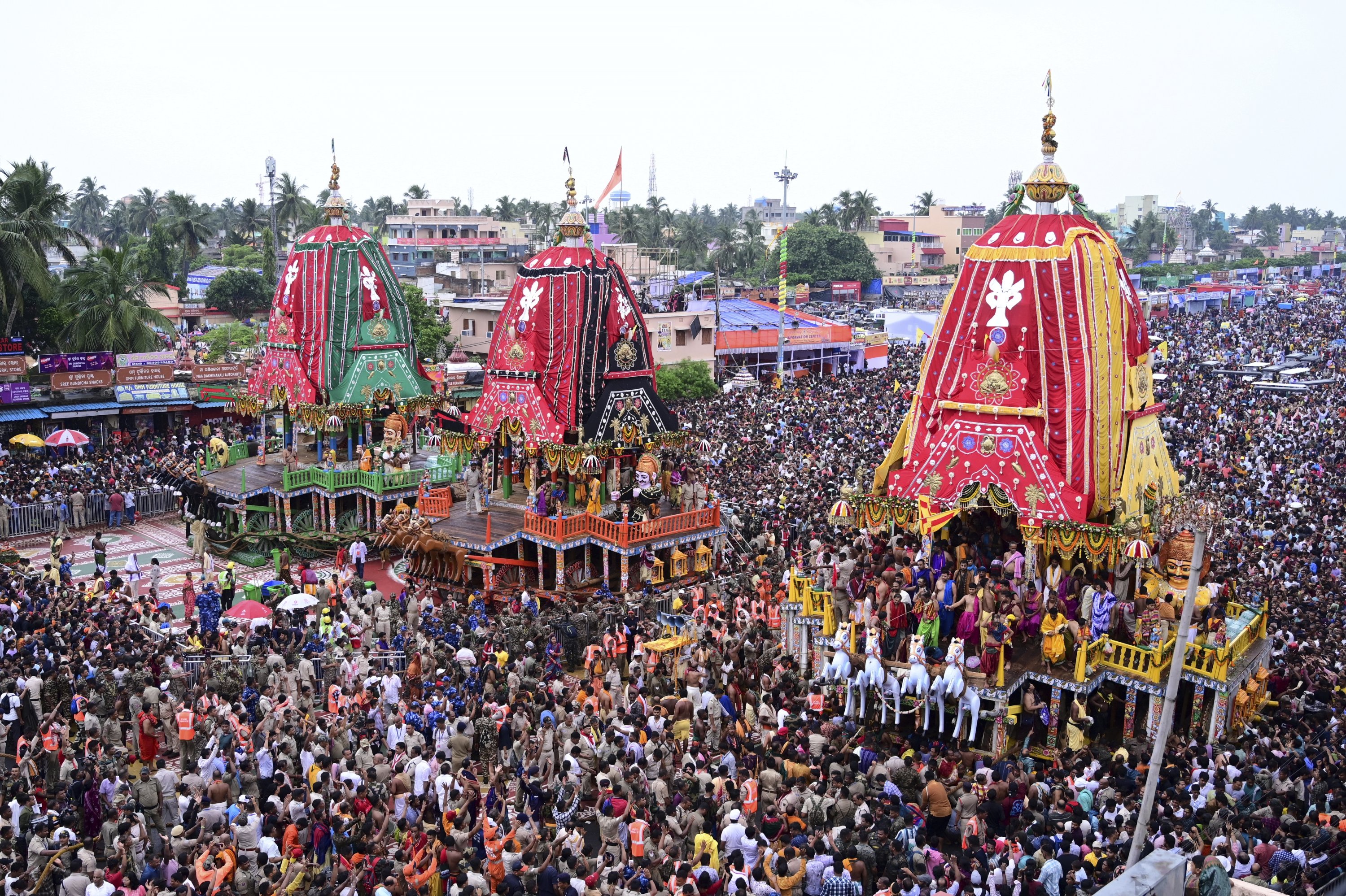 Tens of thousands of devotees gathered in the coastal town early Sunday at Shree Gundicha Temple, near the famous Jagannatha Temple, to catch a glimpse of the deities onboard three chariots, Swain said.