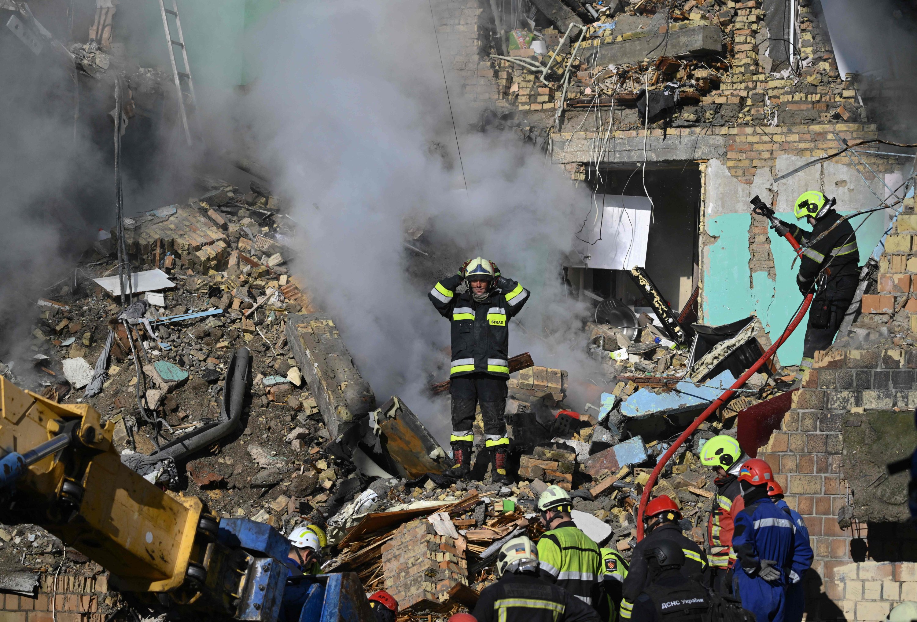 Among the dead were three children ages 2, 14 and 17, said Tymur Tkachenko, the head of Kyiv’s city administration. The numbers are expected to rise. Rescue teams were on site to pull people trapped underneath the rubble.