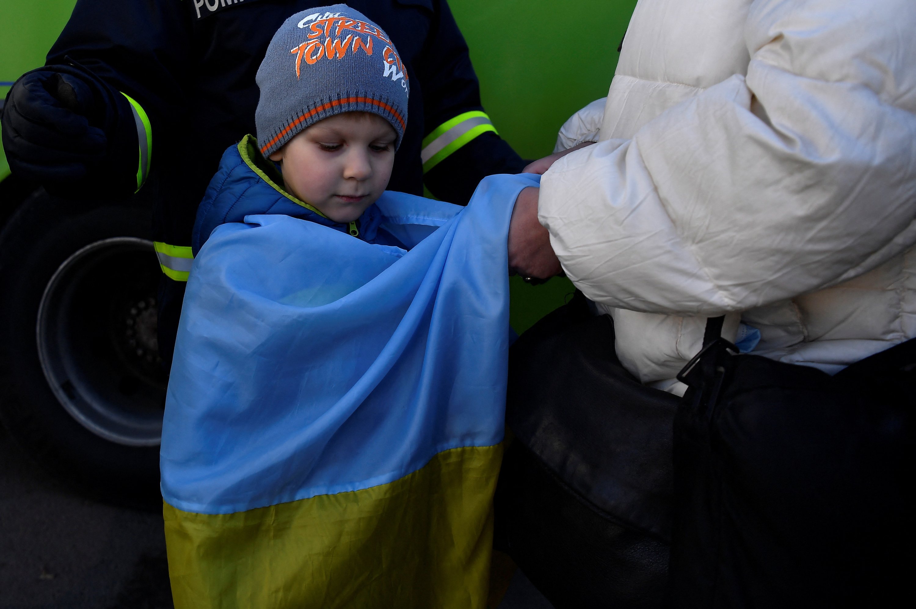 Ivan Iustushenko, 5, is wrapped in a Ukrainian flag by his grandmother after fleeing from Mariupol in Ukraine to Romania, following Russia's invasion of Ukraine, at the border crossing in Siret, Romania, March 22, 2022. (Reuters Photo)