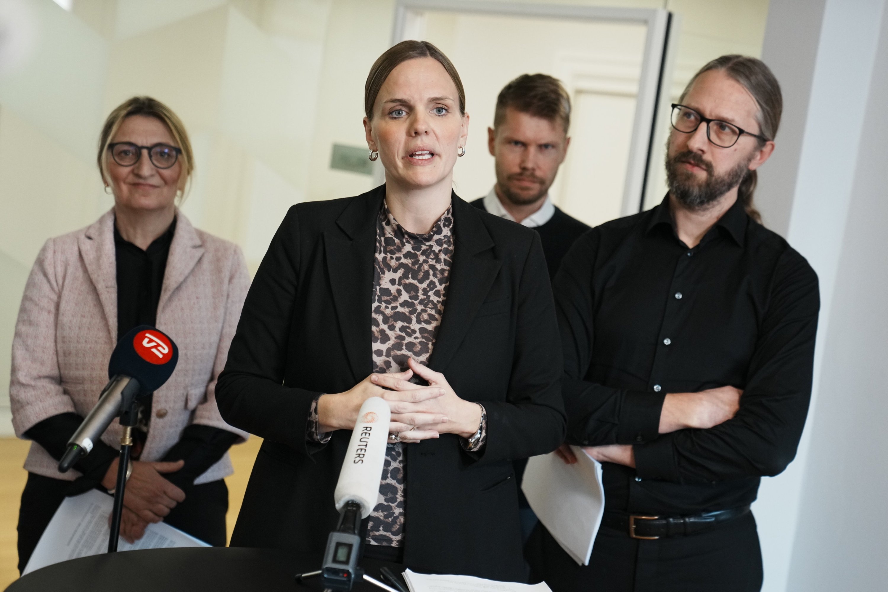 Danish Minister for Digitalization Caroline Stage Olsen (2-L) and representatives from the agreement parties attend a press conference about a new political agreement for better protection of children and young people online, in Copenhagen, Denmark, Nov. 7, 2025.  (EPA Photo)