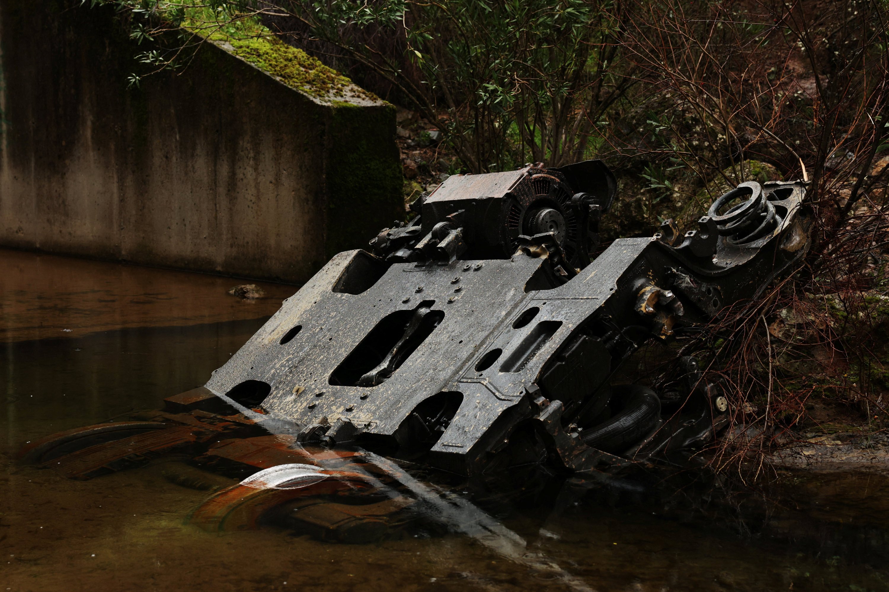 Photographs taken by Reuters on Tuesday showed a large metal structure lying partly submerged in a narrow stream beside a railway bridge, about 15 meters (49 feet) below the tracks and roughly 300 meters from the crash site.