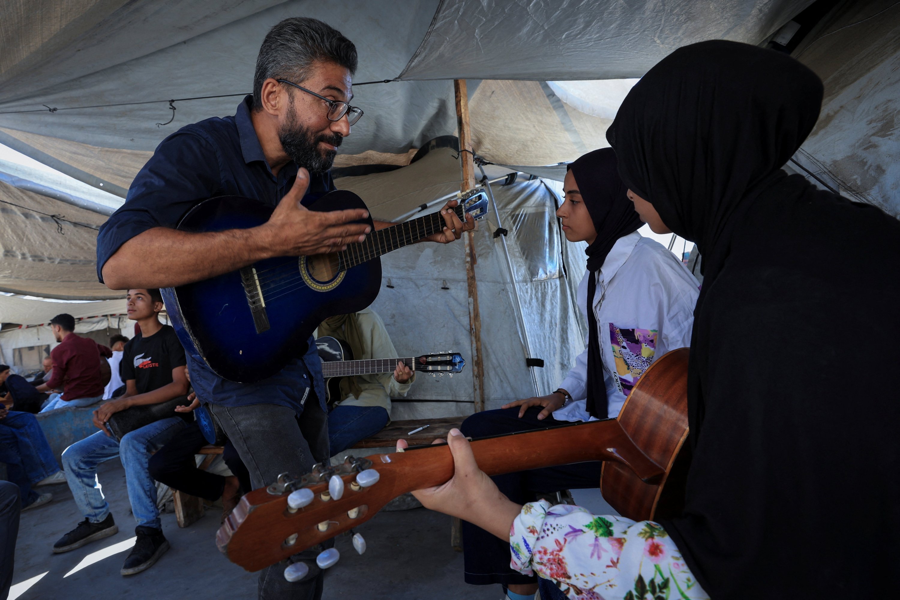 Early last year, Ahmed Abu Amsha, a guitar and violin teacher with a big beard and a broad smile, was among the first of the conservatory's scattered teachers and students to begin offering classes again, playing guitar in the evenings among tents of displaced people in southern Gaza, where much of the 2.1 million population had been forced to move by Israeli evacuation orders and bombing.