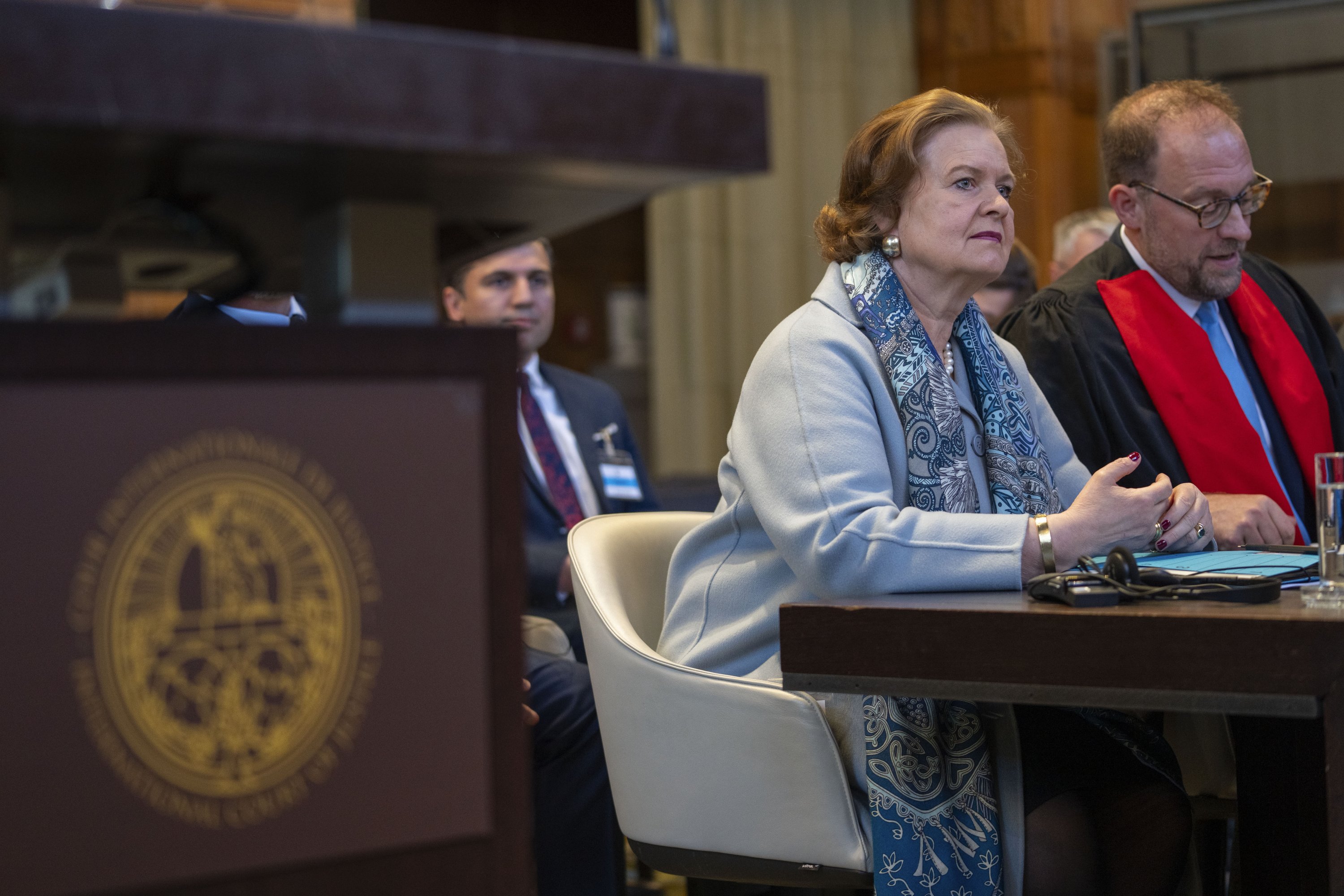 Tania von Uslar-Gleichen, Germany's legal adviser (L), and member of Germany's legal team, Christian J. Tams (R) wait for judges to enter the International Court of Justice where the court is ruling on a request by Nicaragua to order Germany to halt military aid to Israel, arguing that Berlin's support enables acts of genocide, in The Hague, Netherlands, April 30, 2024. (AP File Photo)