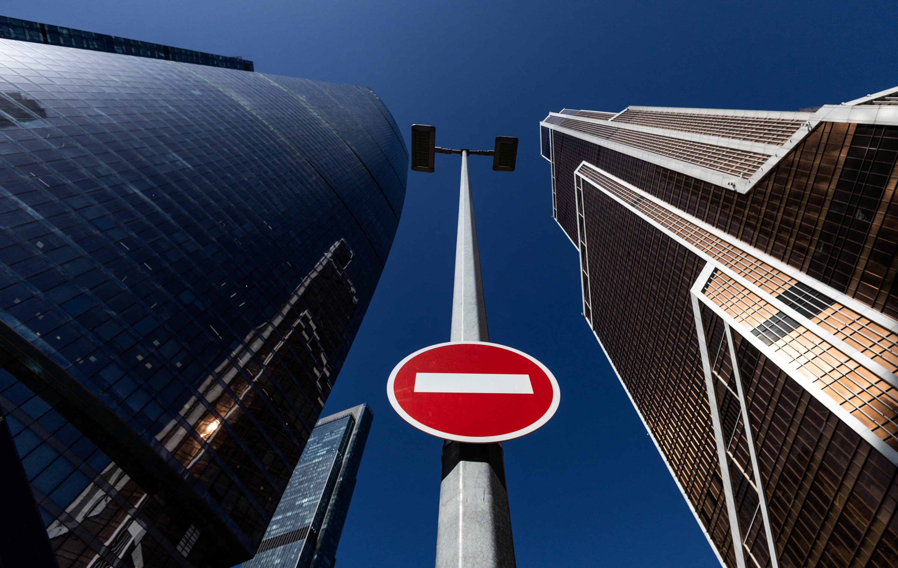A stop road sign is seen next to skyscrapers at Moscow International Business Center, also known as "Moskva-City," in Moscow, Russia, April 14, 2022. (Reuters Photo)