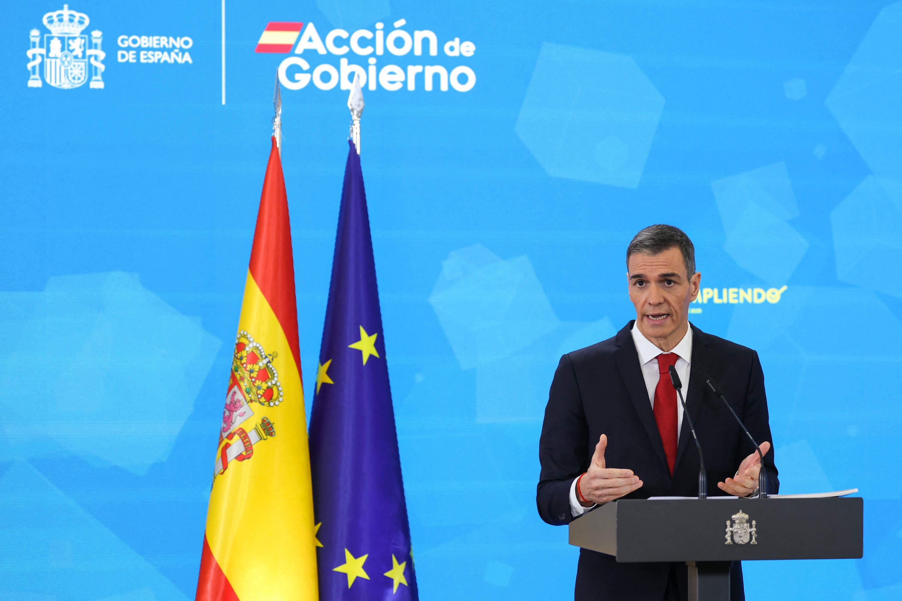 Spain's Prime Minister Pedro Sanchez gestures during a press conference at the Moncloa Palace in Madrid, Dec. 15, 2025. (AFP Photo)