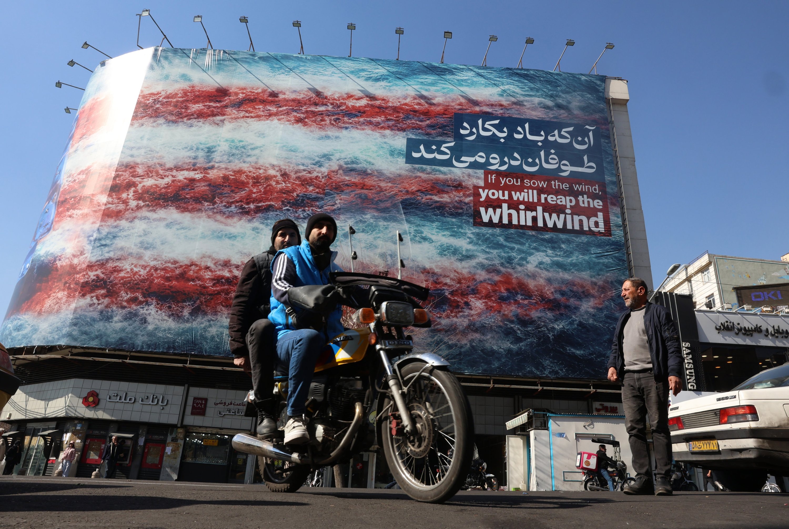 Iranians drive past an anti-U.S. billboard at Enqelab Square in Tehran, Iran, Feb. 16, 2026. (EPA Photo)