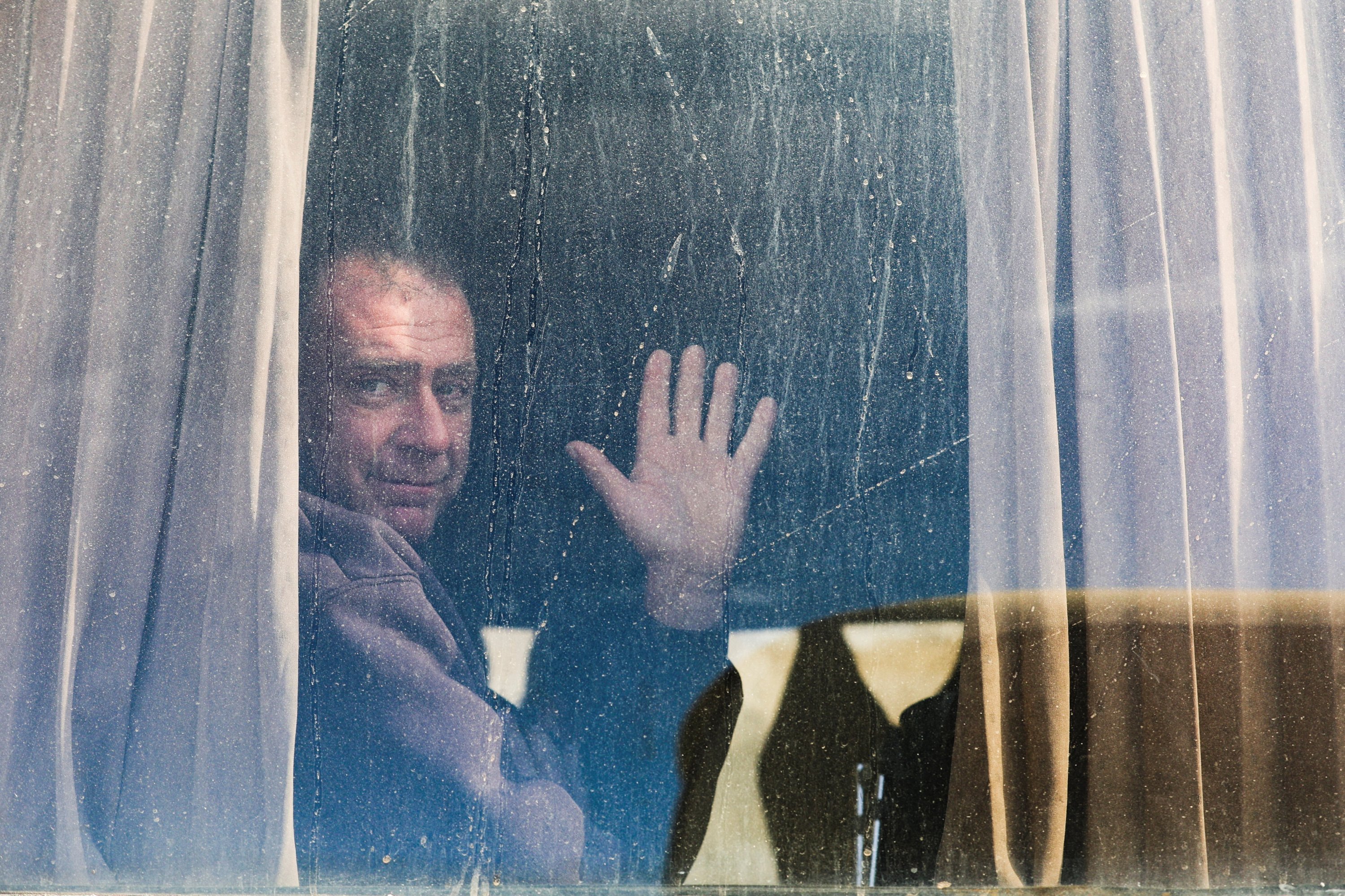 A Palestinian man waves from a window as war-wounded people, accompanied by relatives, get ready to leave Gaza through the Rafah border crossing between Gaza and Egypt, in Khan Younis in the southern Gaza Strip, Feb. 3, 2026. (Reuters Photo)