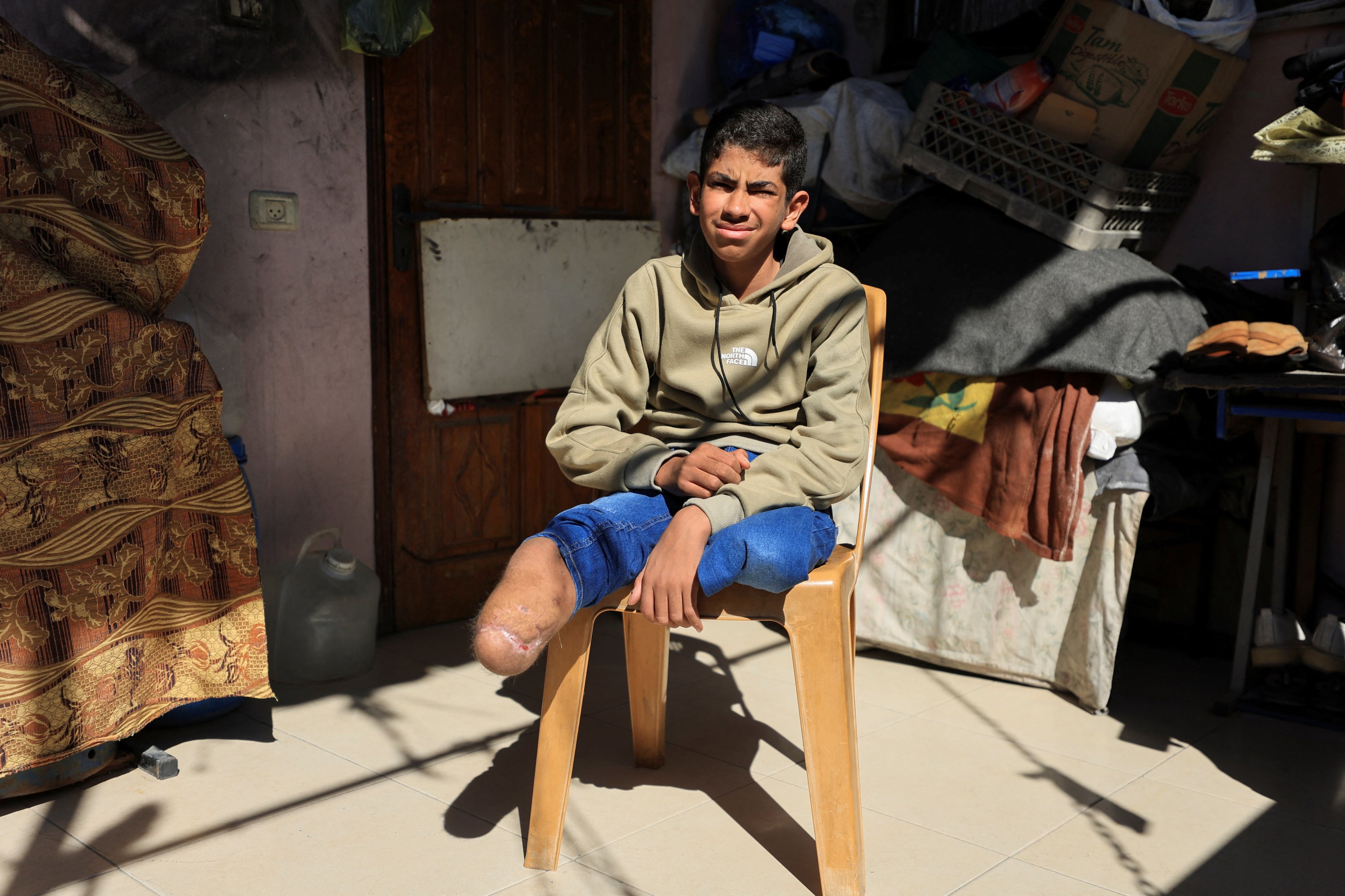 Fourteen-year-old Fadel al-Naji used to be a keen footballer but is now largely confined to his home in Gaza City since both legs were severed in an Israeli drone attack in September. He sits sullenly on a couch with one hollow pant leg dangling and the other tucked into his waist beside his 11-year-old brother, who lost an eye in the same strike.