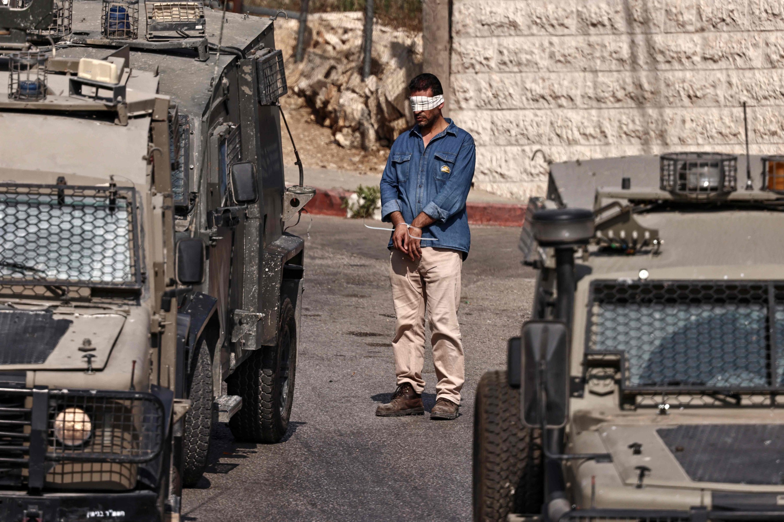 A Palestinian man stands with his hands tied and blindfolded during a raid by Israeli forces on Ramallah city in the occupied West Bank, Palestine, Sept. 16, 2025. (AFP Photo)