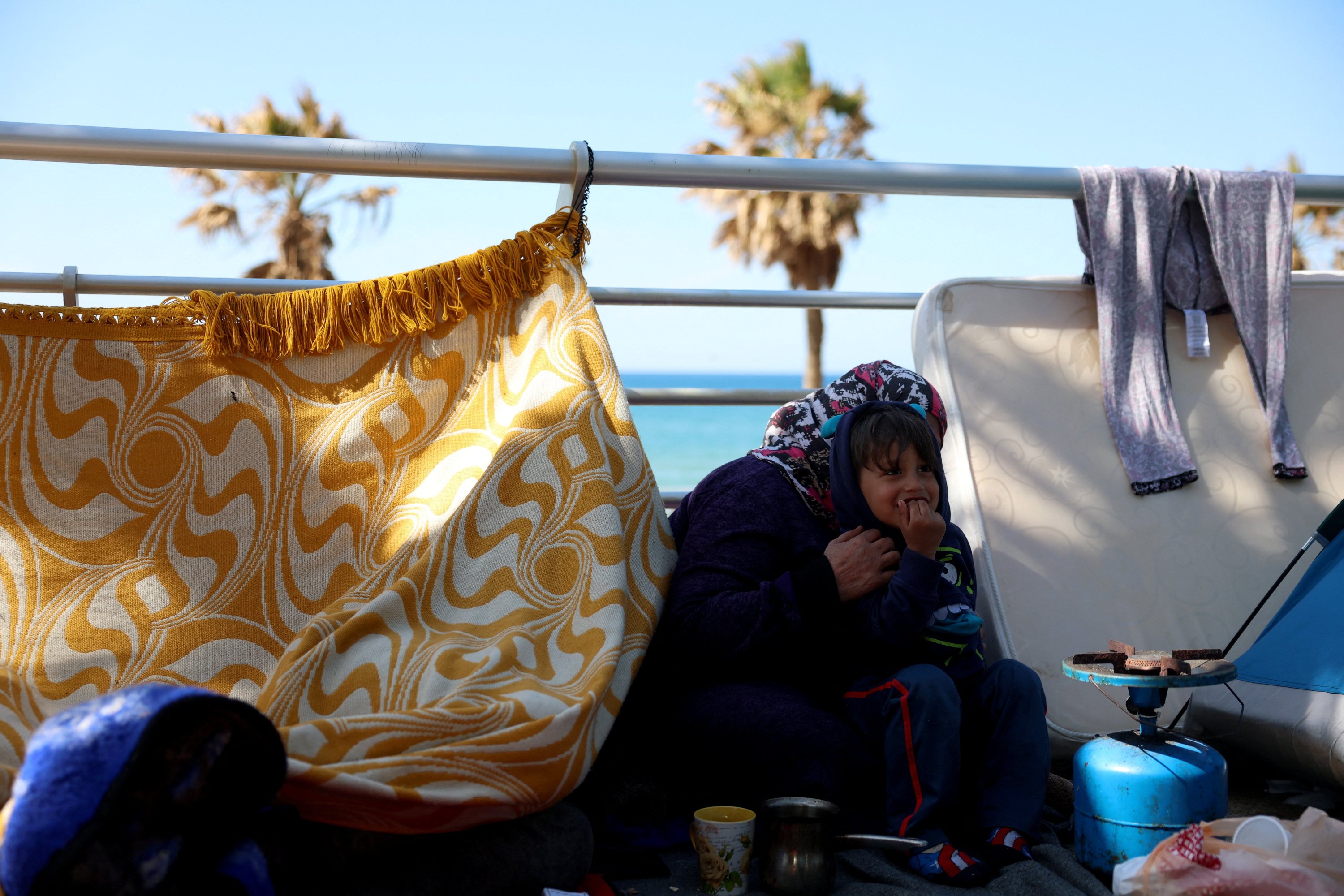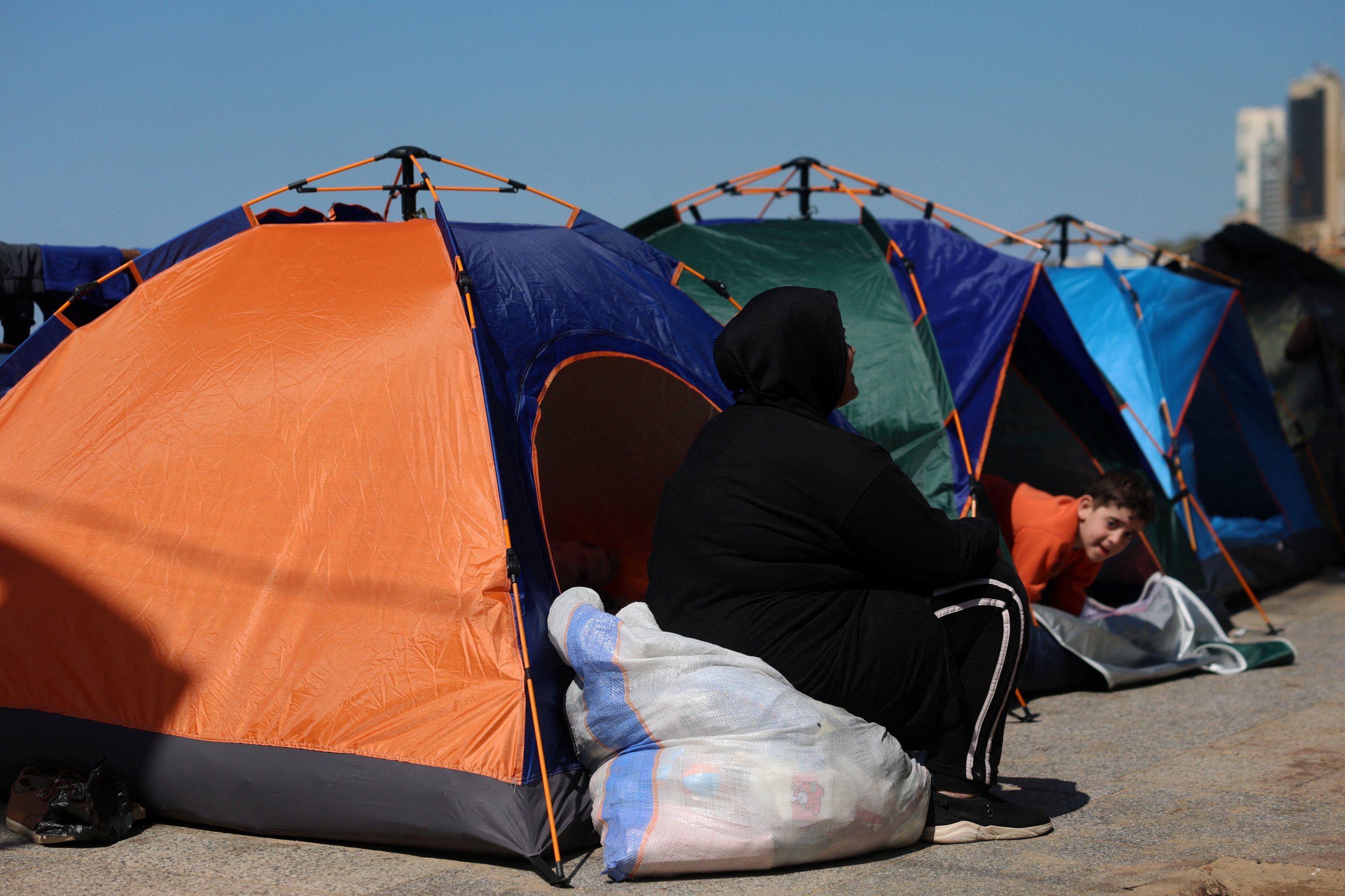 Children drift between sleep and restlessness while parents scroll through their phones, searching for news from the homes they abandoned as airstrikes intensified.