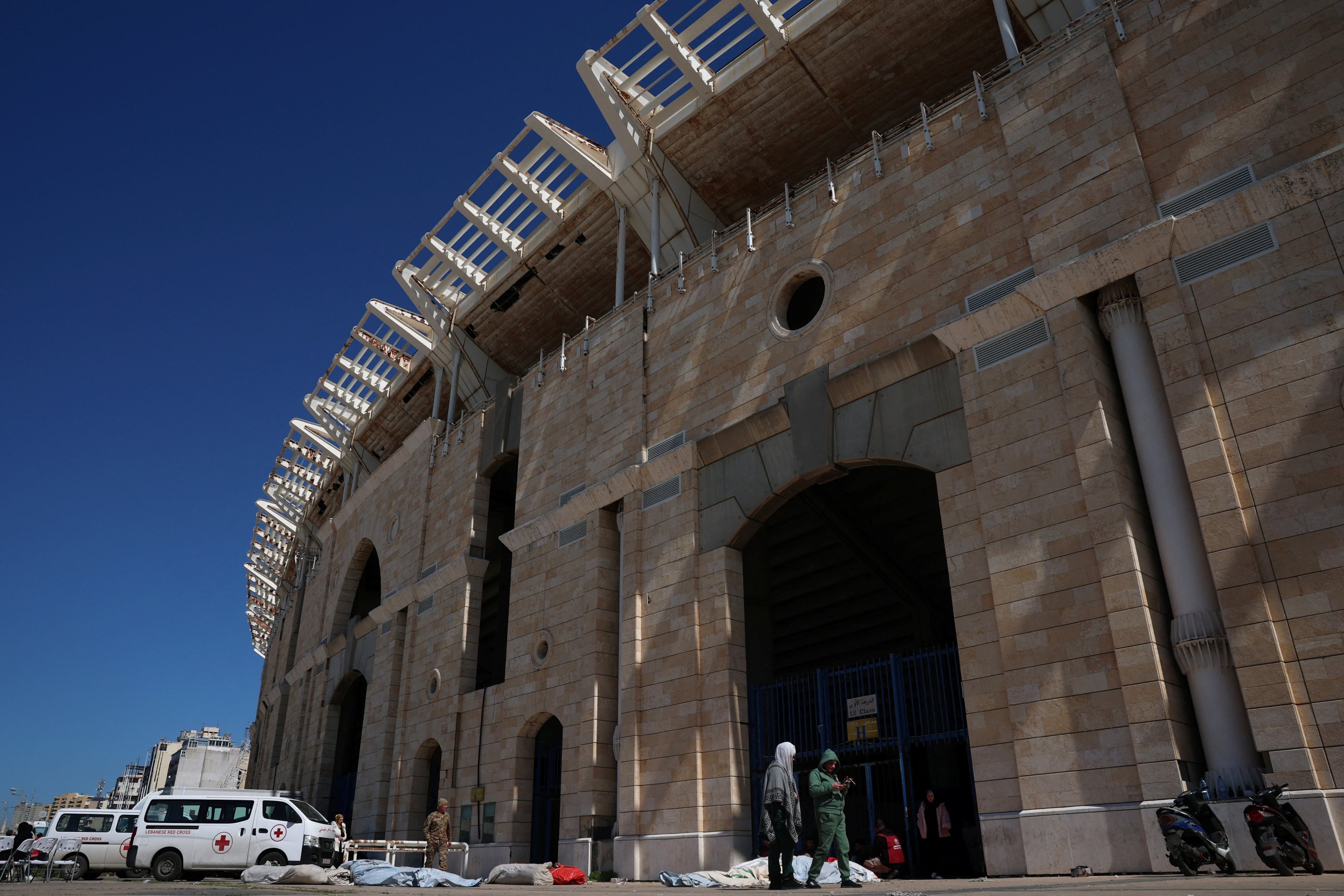 Inside Beirut’s largest football stadium, the chants and thunder of matchday crowds have been replaced by the quiet shuffle of hundreds of displaced families trying to sleep on thin mattresses spread across cold concrete.